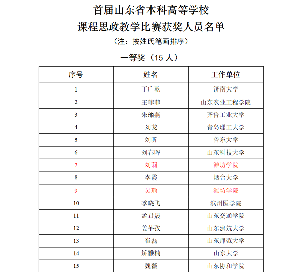 为全面推进课程思政建设,将思想政治工作贯穿教育教学全过程,不断提升高校教师课程思政教学水平和育人能力,7月12日,由山东省高等学校课程思政研究中心举办的首届山东省本科高等学校课程思政教学比赛决赛在齐鲁工业大学(山东省科学院)长清校区落下帷幕。我校化学化工与环境工程学院副教授刘莉、传媒学院副教授吴瑜2名教师获得一等奖。我校获奖等级和数量位居全省68所参赛高校第1名,是全省唯一一所获得2项一等奖的高校,成绩喜人、可圈可点。