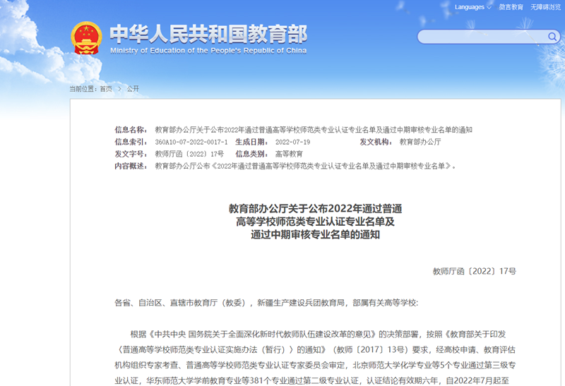 近日,教育部办公厅发布《关于公布2022年通过普通高等学校师范类专业认证专业名单及通过中期审核专业名单的通知》,经高校申请、教育部评估中心和山东省教育科学研究院分别组织专家考查、普通高等学校师范类专业认证专家委员会审定,我校小学教育专业通过第二级专业认证,认证有效期六年(2022年7月至2028年6月)。截至目前,我校共有数学与应用数学和小学教育2个专业通过这一认证。