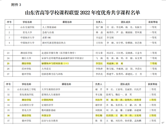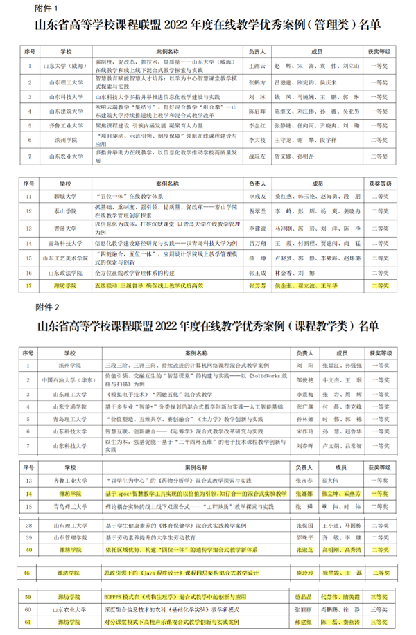 近日,山东省教育厅公布了山东省高等学校课程联盟2022 年度在线教学优秀案例和优秀共享课程获奖名单,我校推荐的11项参评成果中9项获奖,其中课程教学类一等奖1项,二等奖2项,三等奖2项;管理类教学案例二等奖1项,优秀共享课程二等奖2项,三等奖1项,获奖总数和比例在同类高校中位居前列。
