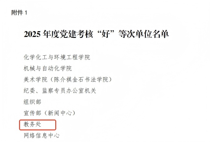 同时,教务处也入选了2025年度中层单位绩效考核先进单位名单,实现了党建与业务工作的“双优”佳绩。此项荣誉既是对过去一年工作的认可,更是对未来发展的激励。教务处党支部将以此为契机,珍惜荣誉,再接再厉,持续强化党建引领,不断提升管理服务水平,为学校加快高质量发展、建设国内一流应用型大学贡献力量。
